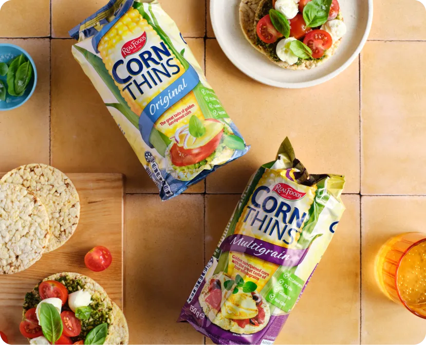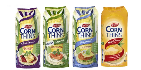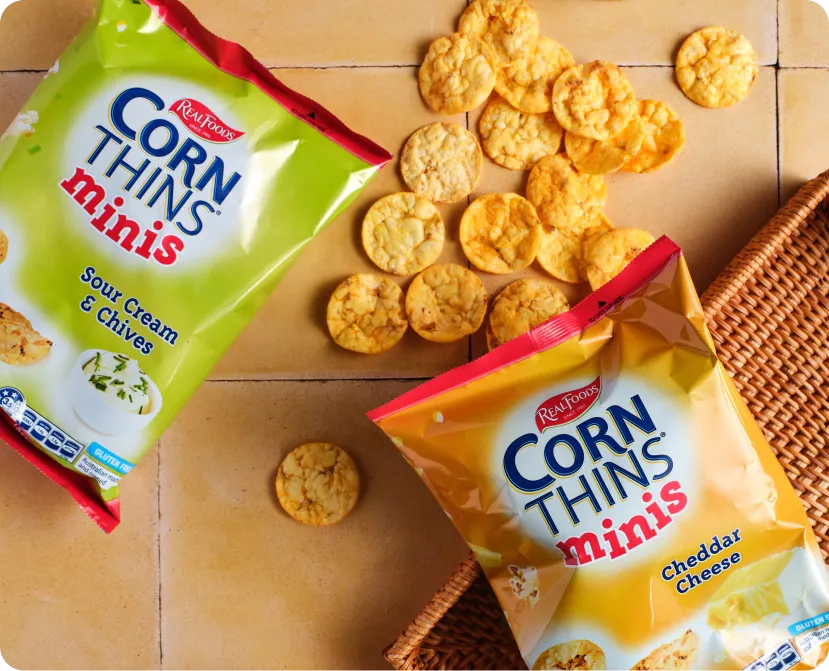 Corn Thins™—the deliciously light and crispy popped corn cakes that bring the wholesome goodness of golden sun-ripened corn to your snacking experience.