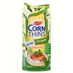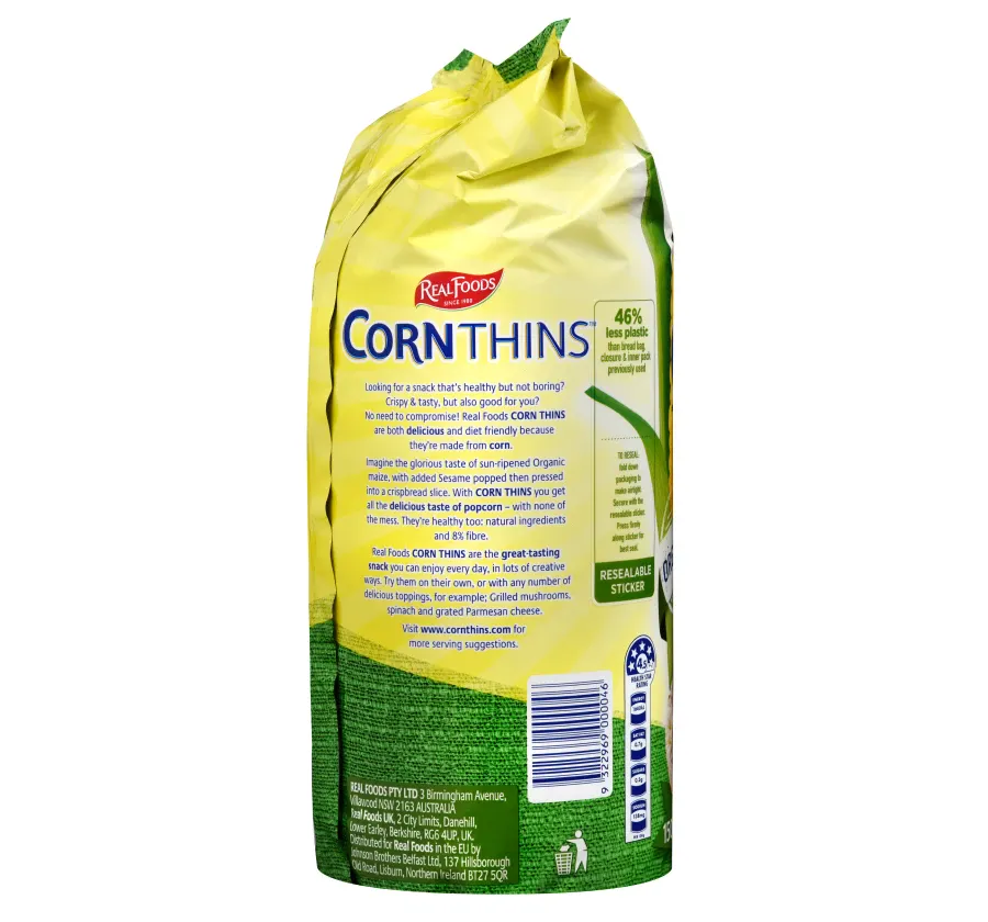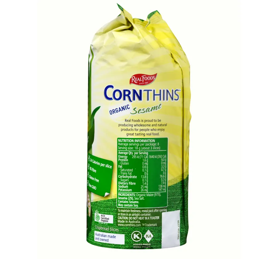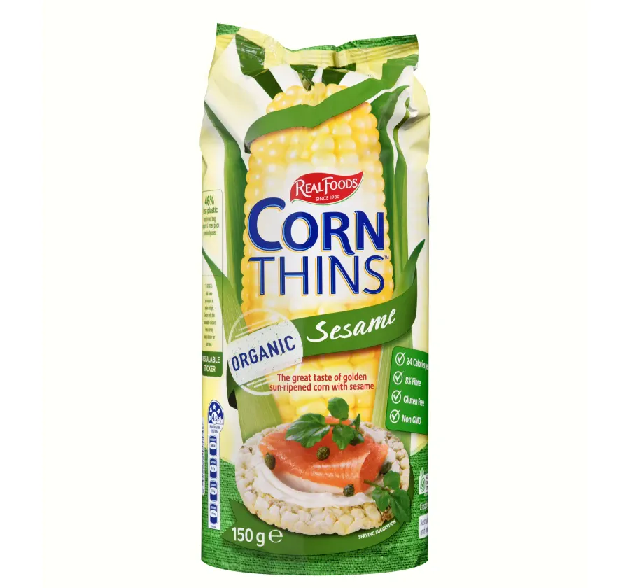 Corn Thins™ Sesame Organic is made primarily from grains of organic golden corn, with added sesame, so taste like popcornwith a slight nutty sesame flavor, squished into a popped corn cake.