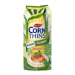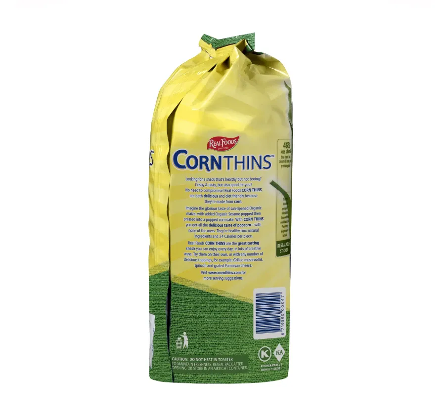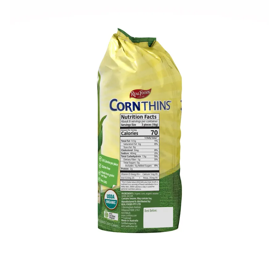 Corn Thins™ Sesame Organic is made primarily from grains of organic golden corn, with added sesame, so taste like popcorn, with a slight nutty sesame flavor, squished into a popped corn cake.