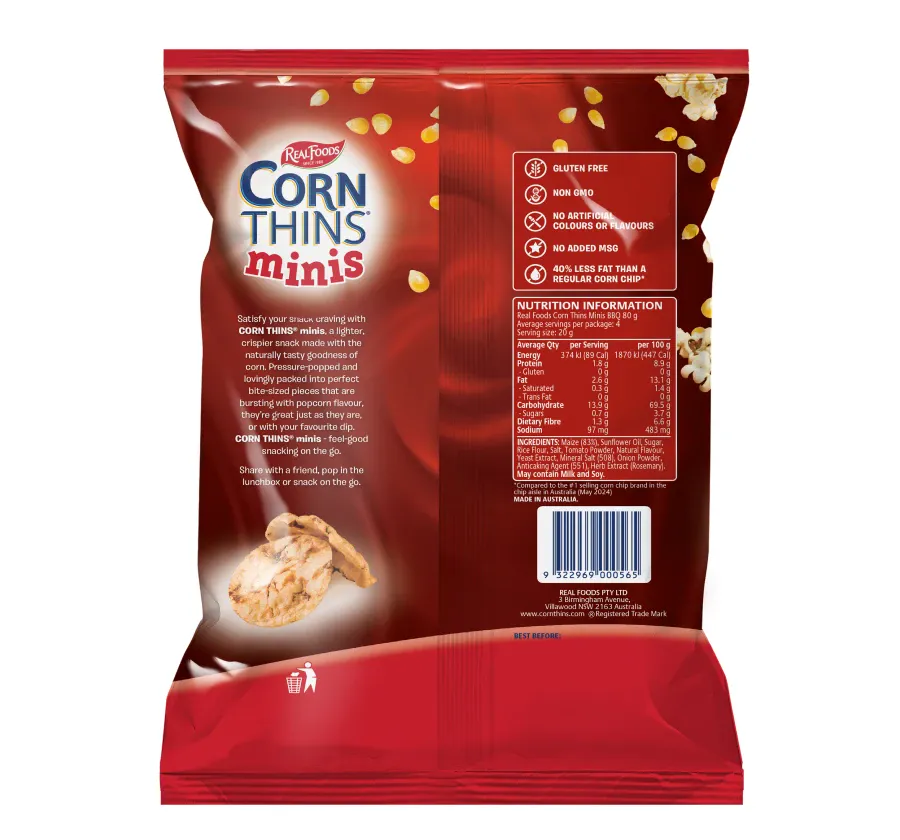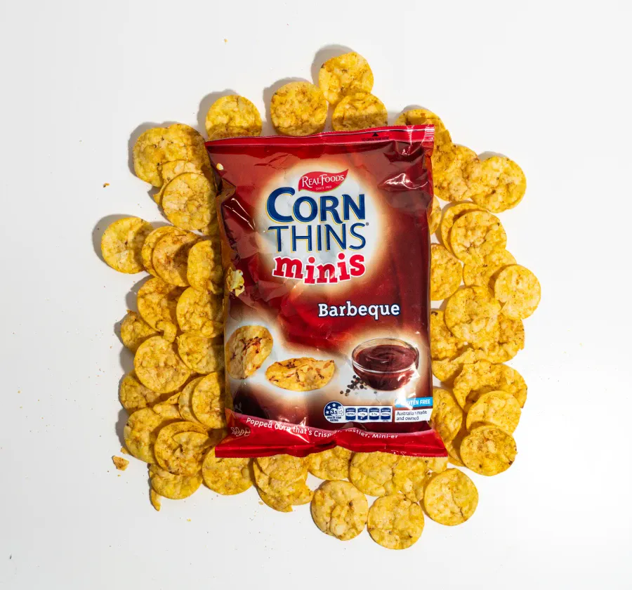 Satisfy your snack cravings with CORN THINS® Minis – a lighter, crispier snack made with the naturally tasty goodness of corn. Pressure-popped and lovingly packed into perfect bite-sized pieces that are bursting with popcorn and barbeque flavour, they’re great just as they are – or with your favourite dip. CORN THINS® Minis – feel good snacking on the go.